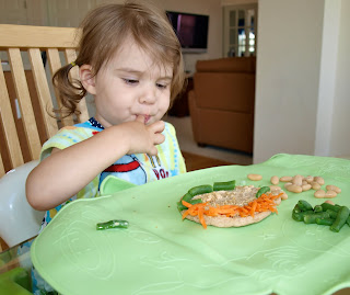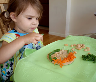 She ate the beans right away, smiling when I said, “Ooooh, you ate his eyes! Oh, there goes the nose!” Yep, I’m such a dork. But I love making her smile.