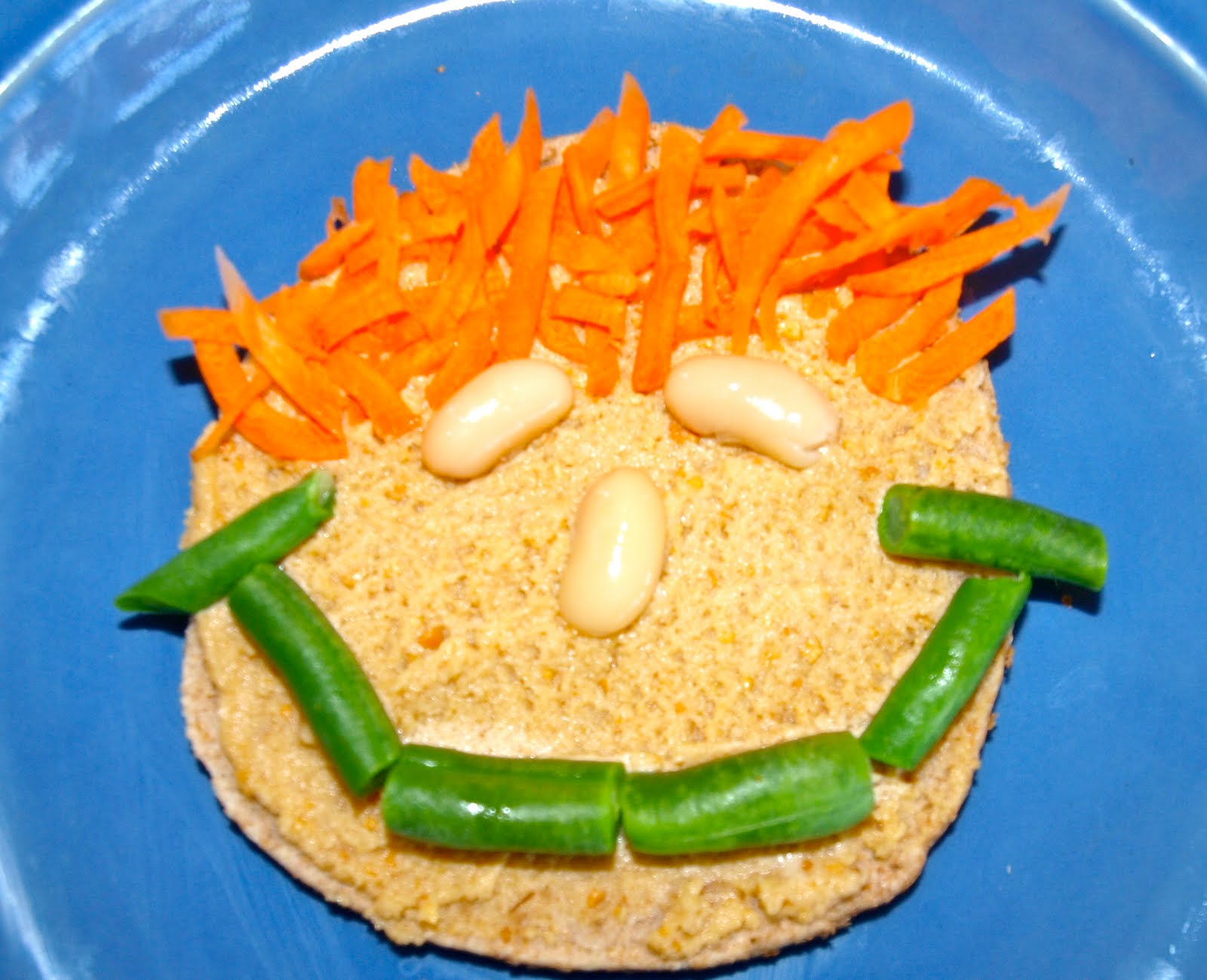 peanut butter, tahini (sesame seed paste), and goat’s milk yogurt (any plain yogurt would work). One teaspoon of each in bowl, a quick mix, and I had a spread for her sandwich. Then I added the shredded carrots for the hair, beans for the eyes and nose, and some green beans made the smile. The verdict?