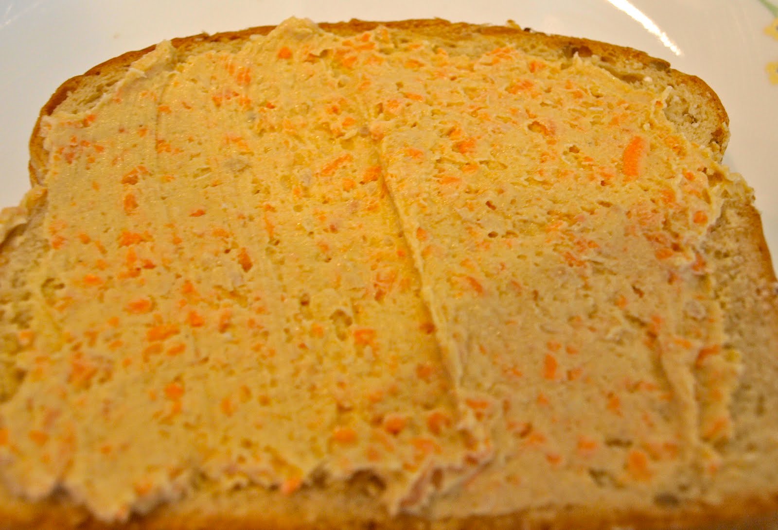 For this one, I put 1 tablespoon shredded carrots, 1 tablespoon white beans, and 2 tablespoons tahini, and a small pinch of sea salt in the food processor and processed it until it was of a spreadable consistency. (A blender might work for this, too) This is what it looked like when I spread it on the bread: