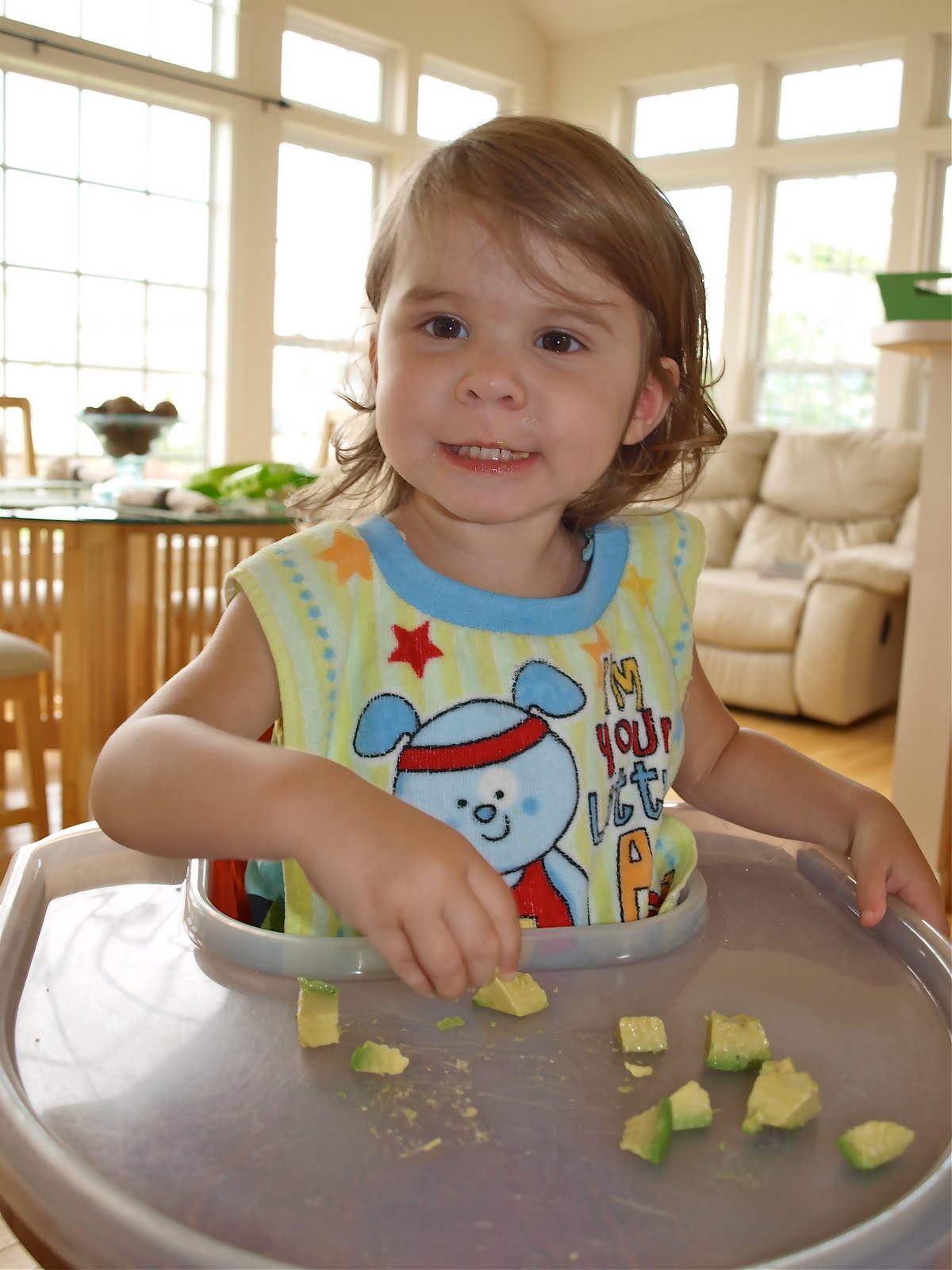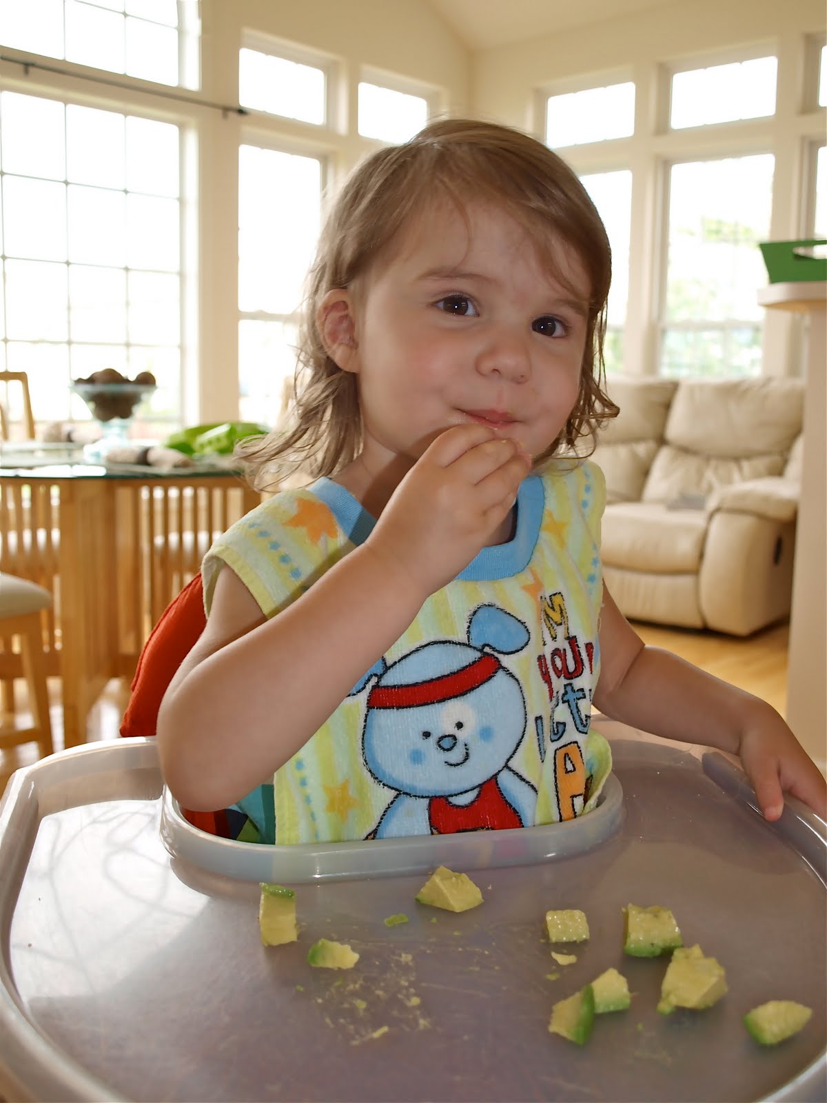 I am happy to report that Meghan seems to be getting back on track this week with her eating. Today for lunch I pulled out an avocado that I knew was going to go bad if we didn’t eat it up soon. Eating avocados before they go bad is never a problem in this house, but with Meghan’s fruit and veggie strike there are a few they are on the brink. I was nervous as I cut it into chunks and served it to her, but knew my girl was back when she exclaimed, “Mmmmmm, ‘cado!” Here she is gobbling it up: