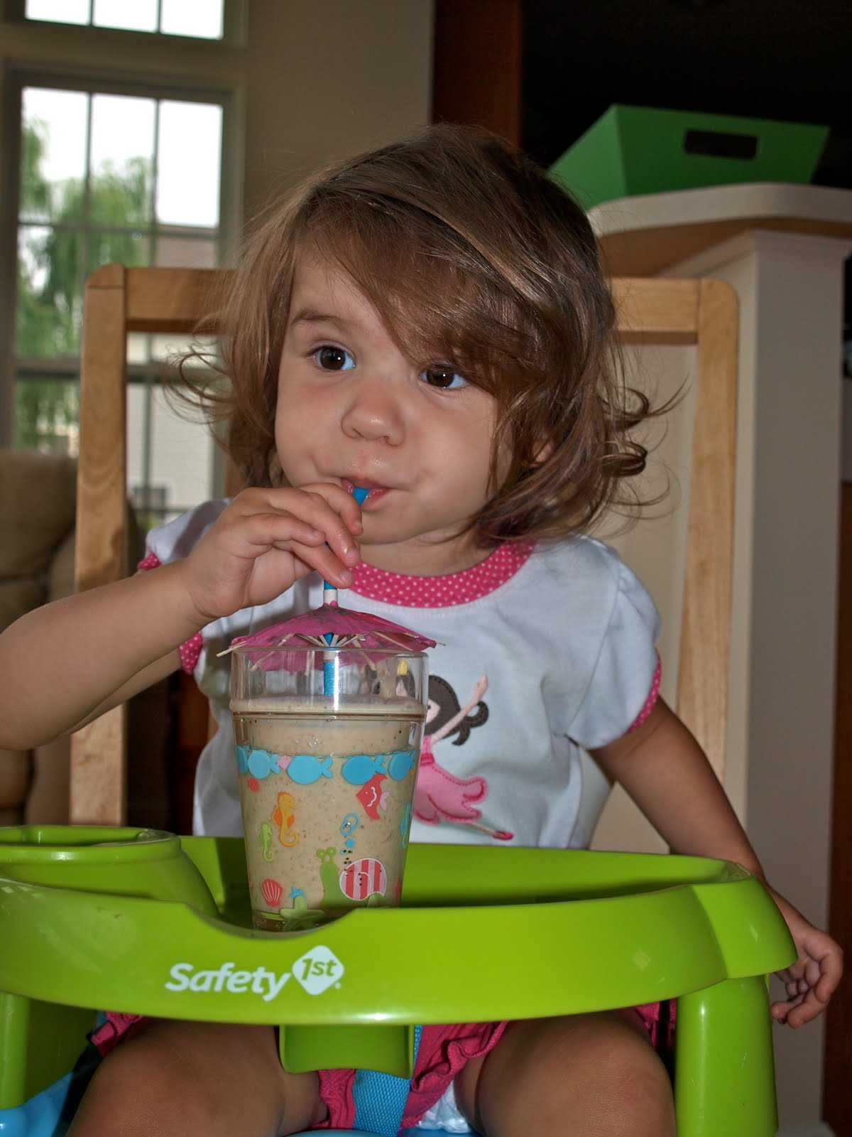 There is one thing that she usually will not refuse: smoothies. The next day after her all-dairy day I turned to the smoothie to help rectify the no fruit or veggie situation. The great thing about smoothies is that you can make it super healthy and it still seems like a treat. They are great for breakfast and Meghan also regularly eats them for snack. They are especially nice if you need breakfast on-the-go. When we need to get somewhere early in the morning, I make a smoothie the night before, put it in her straw sippy cup and refrigerate it, and then in the morning she gets her breakfast in the car.