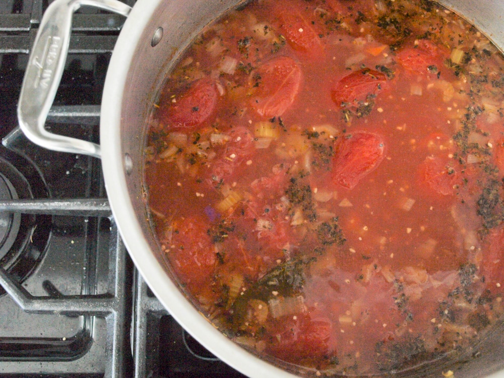 - In a large stock pot, heat the oil over medium heat. Add the onion, carrot, and celery and cook until soft, about 5-8 minutes. Add the garlic and cook another minute. Add the tomatoes, tomato paste, Italian seasonings, salt, pepper, and chicken broth. Bring to a boil, then reduce the heat and simmer, uncovered, for about 30 minutes.