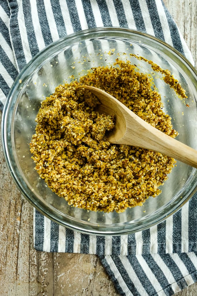 - Add the onion and walnut mixture to the bowl with the flaxseed meal and water. Add the nutritional yeast, basil, oregano, salt, and pepper, and stir to combine well. The mixture will seem like it’s not going to stick together, but you should be able to form it into balls.