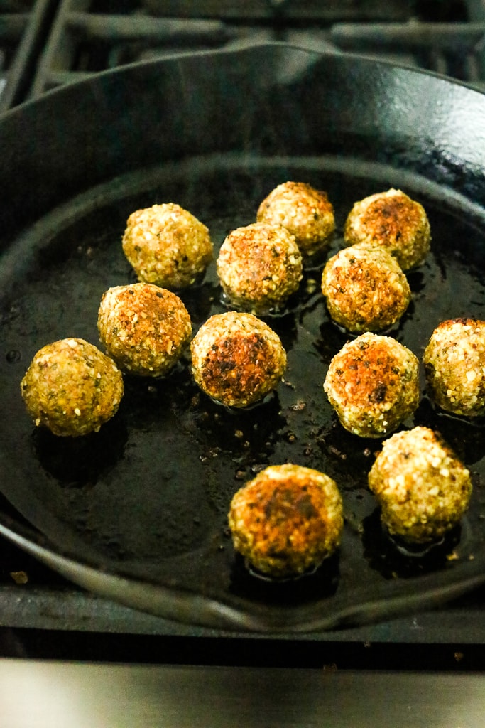 - For best results, add more oil and heat it over medium heat if your skillet is dry. Gently add the balls to the hot oil and pan fry them to get a sear on each side. Carefully turn them as they are cooking so they are browned.