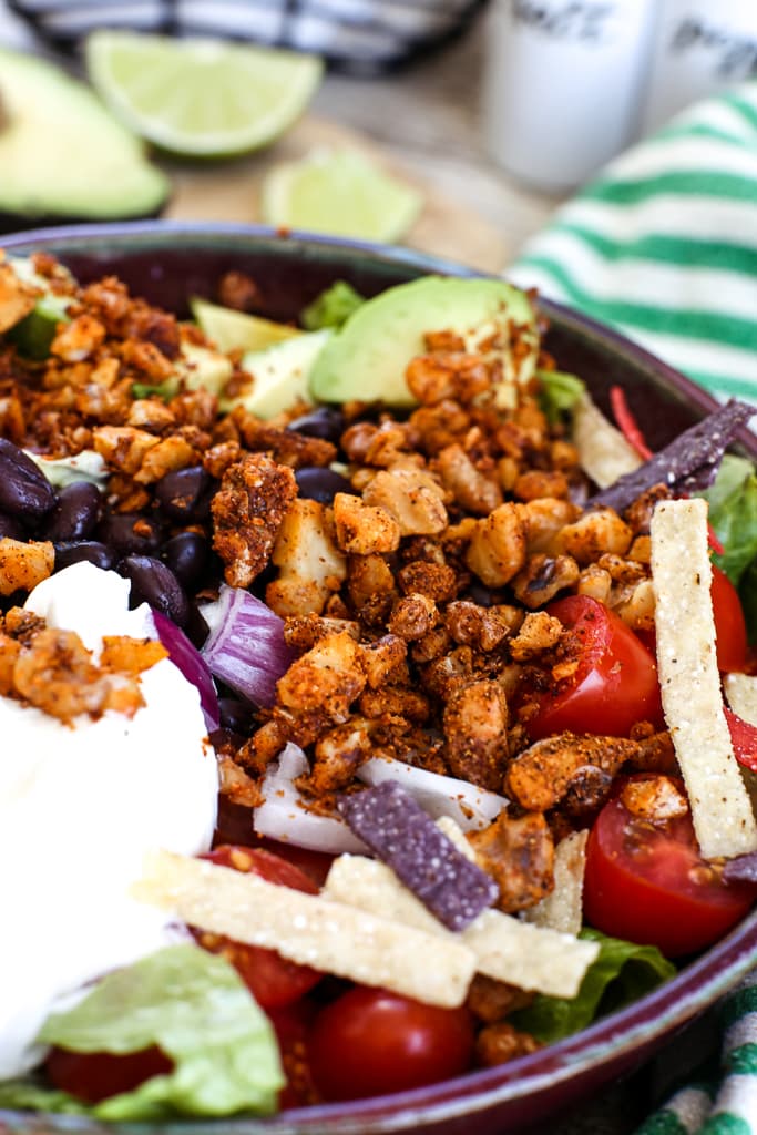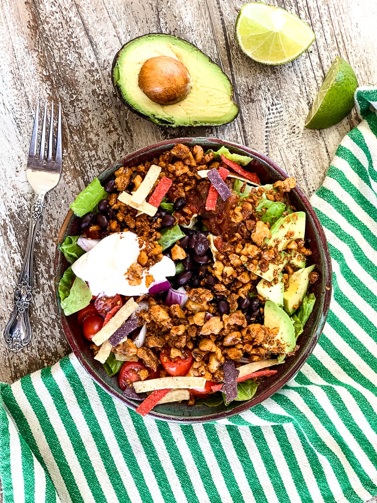 This has all the flavor of regular Taco Salad but in a plant-based version! This is an easy, under 30 minute dinner recipe that’s easy to customize.