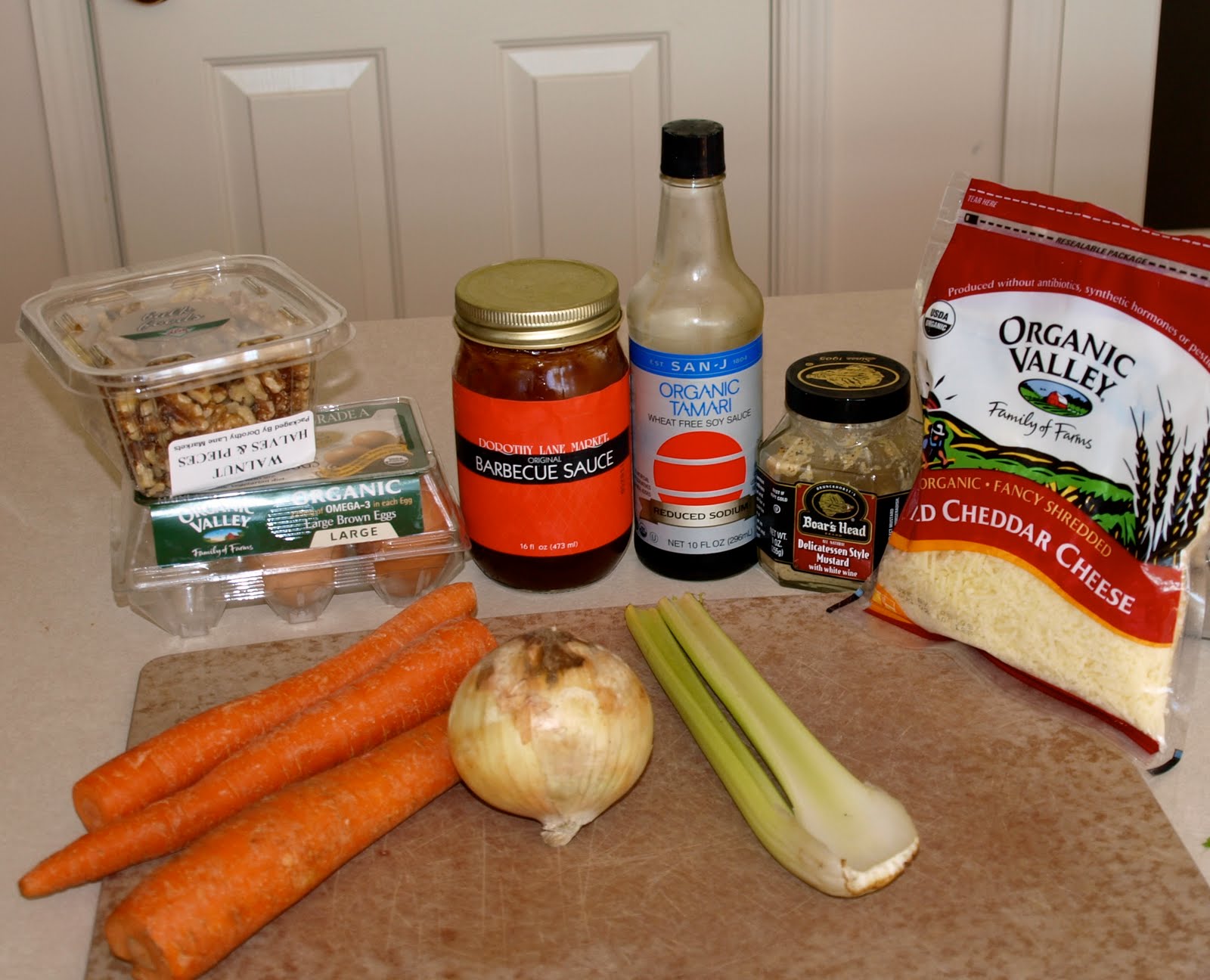 We are getting ready to go out of town for a week, so this was my let’s-try-to-use-up-all-of-the-food-in-the-house meal. When I looked in the fridge and saw we had carrots and celery for vegetables (and not much else) I immediately thought of making a veggie “meatloaf”. Then I realized that’s sort of a winterish dish, so I thought I’d put a summer spin on it by using BBQ sauce and accompanying it with baked beans. It’s hard to find a good BBQ sauce that doesn’t have high fructose corn syrup. Most have that ugly ingredient number one on the list. It’s worth it to take the time to find a good one that doesn’t have HFCS and isn’t too high in sugar. (Finding one without sugar is nearly impossible–let me know if you know of a brand that makes doesn’t have it!)