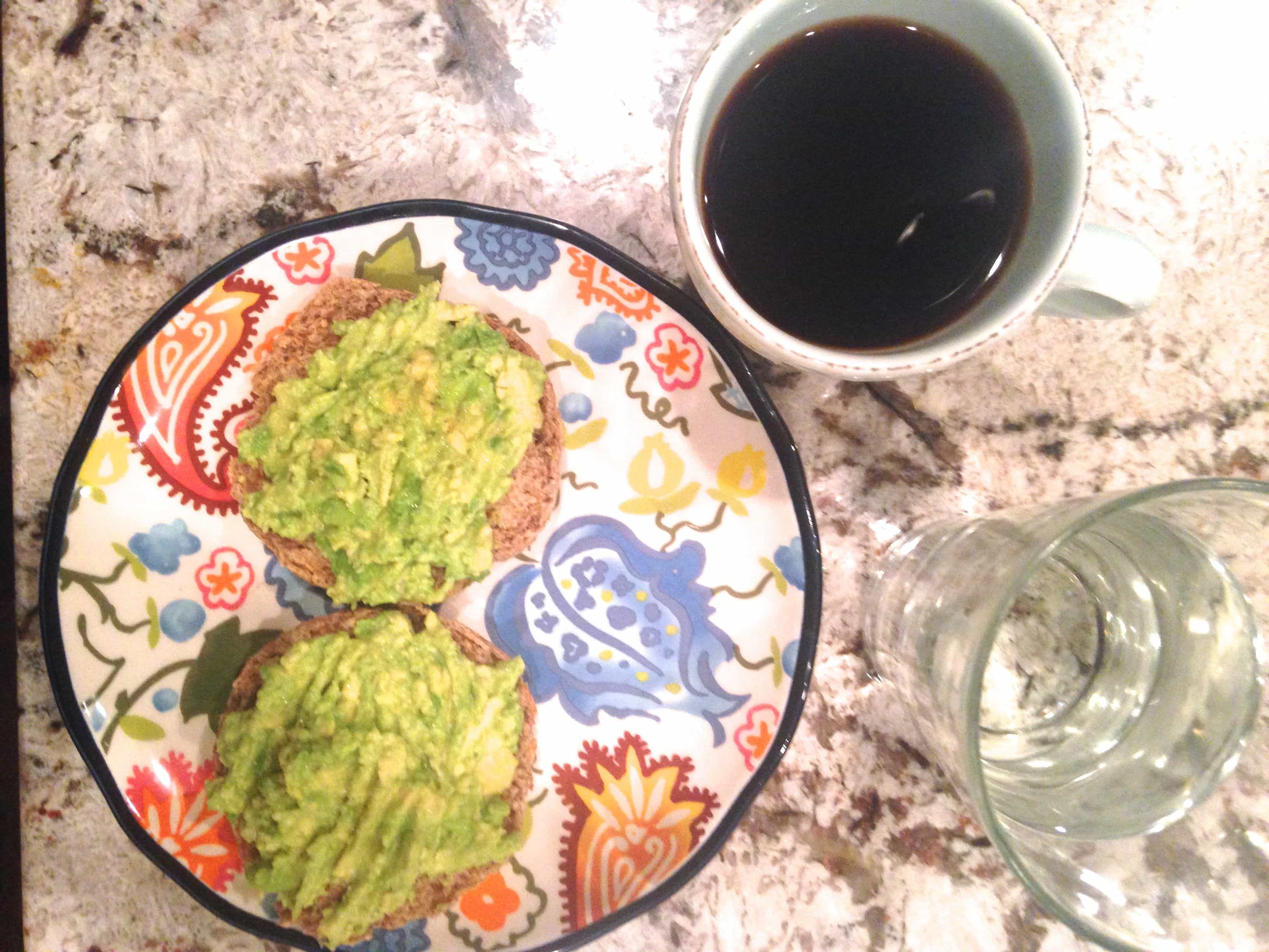 1/2 smashed avocado on top of an Ezekiel Sprouted Whole Grain English Muffin sprinkled with Real Salt , Coffee, and water with lemon essential oil