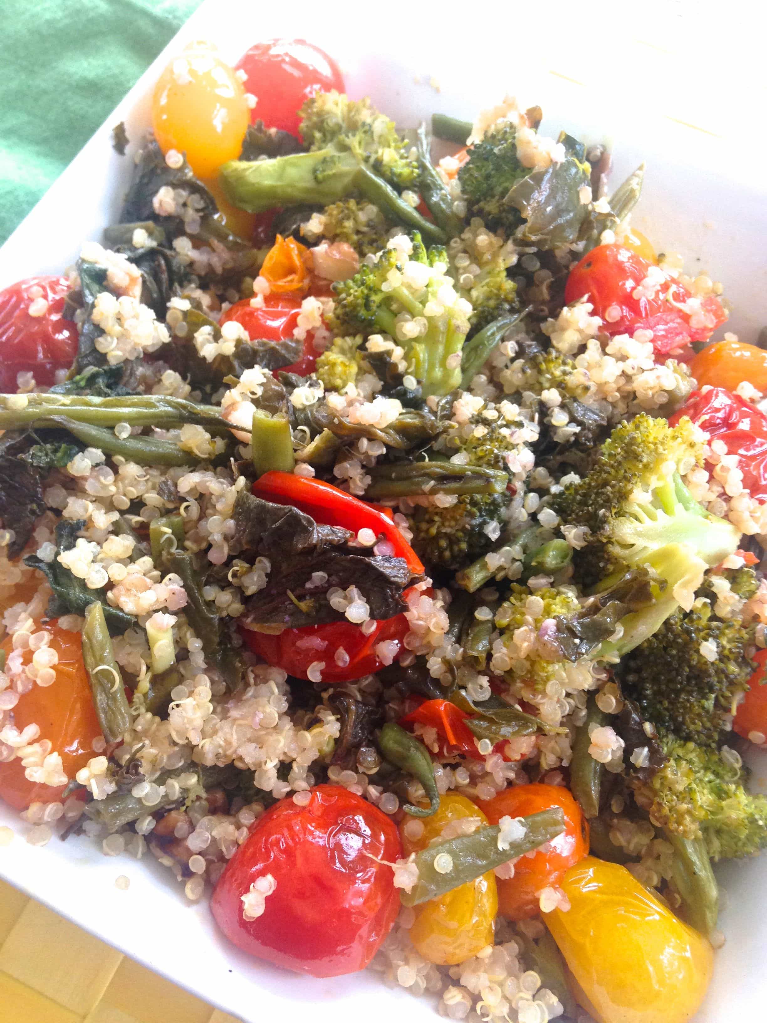 This was a leftover quinoa sauté with broccoli, green beans, and kale. I added some roasted cherry tomatoes. The dressing was just olive oil and lemon. This was really filling!