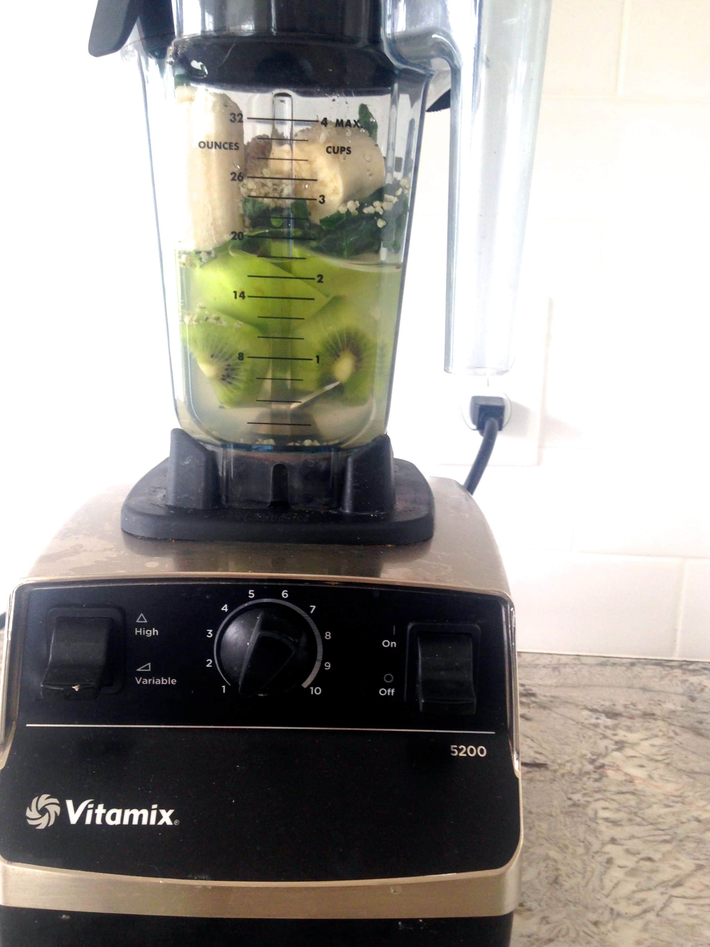 Smoothie with coconut water, a banana, a kiwi, a green apple, spinach, and hemp seeds.