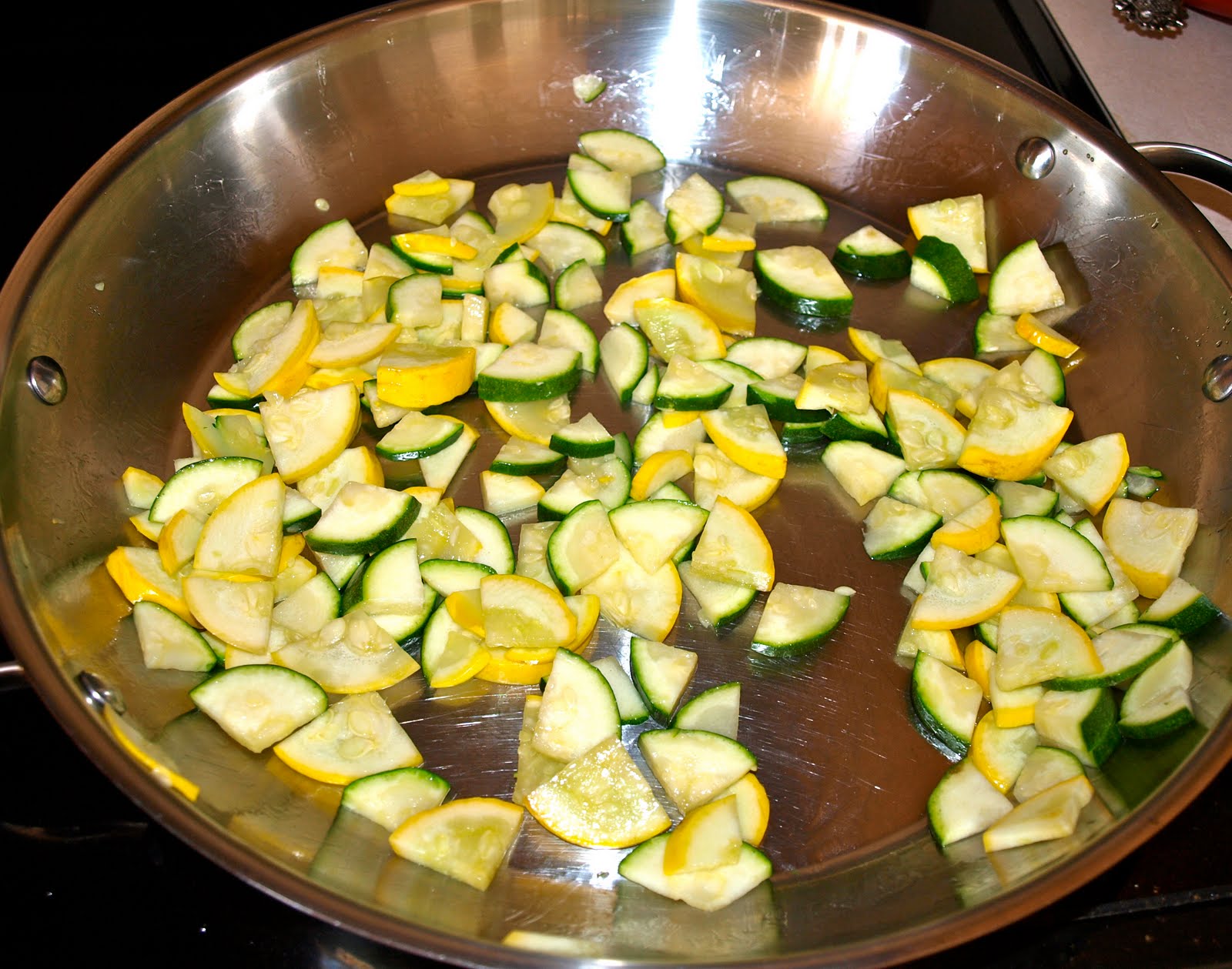 - Heat a few swirls of olive oil in a large skillet. Add your squash to the skillet and saute until it starts to get tender, about 5 minutes.